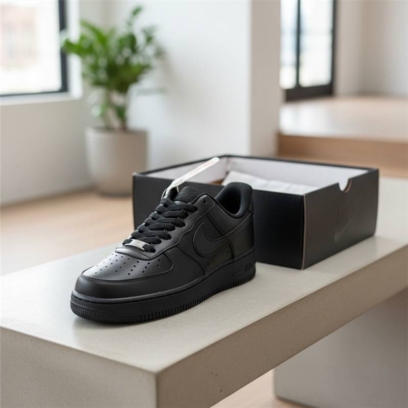 Nike Air Force 1 Black White Sneakers, classic leather low-top shoes with signature Air cushioning, stylish and durable design for everyday wear and street fashion lovers.