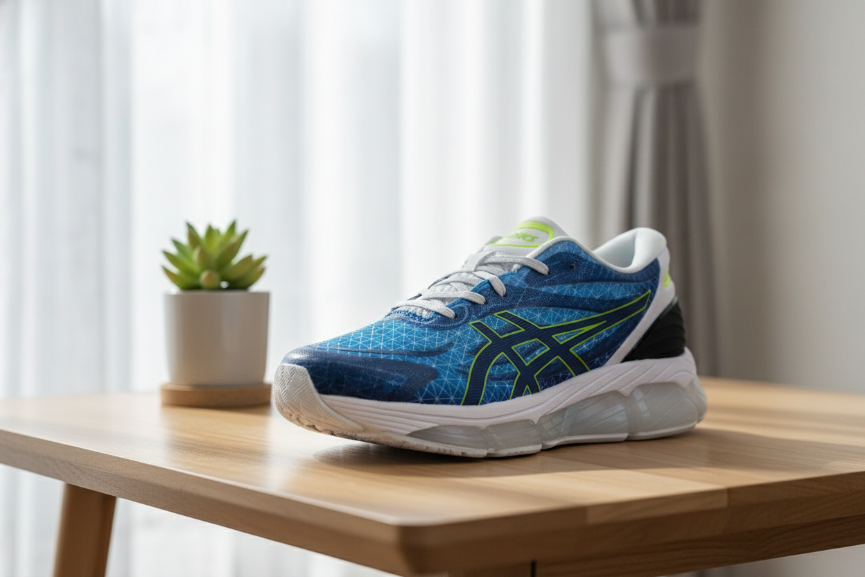 ASICS running shoes in blue, green, white, and black feature a breathable mesh upper, lightweight cushioned sole, iconic stripes, and sleek design for men and women, ideal for running and casual wear.