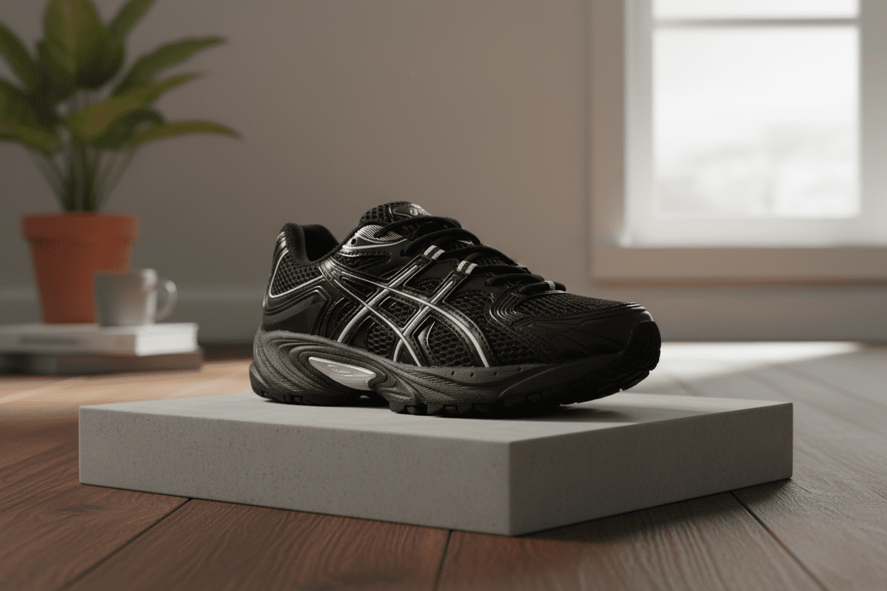 ASICS Classic Running Shoes, black silver design with breathable mesh, signature X pattern, cushioned midsole for comfort and support, unisex retro sporty style perfect for workout or casual wear.