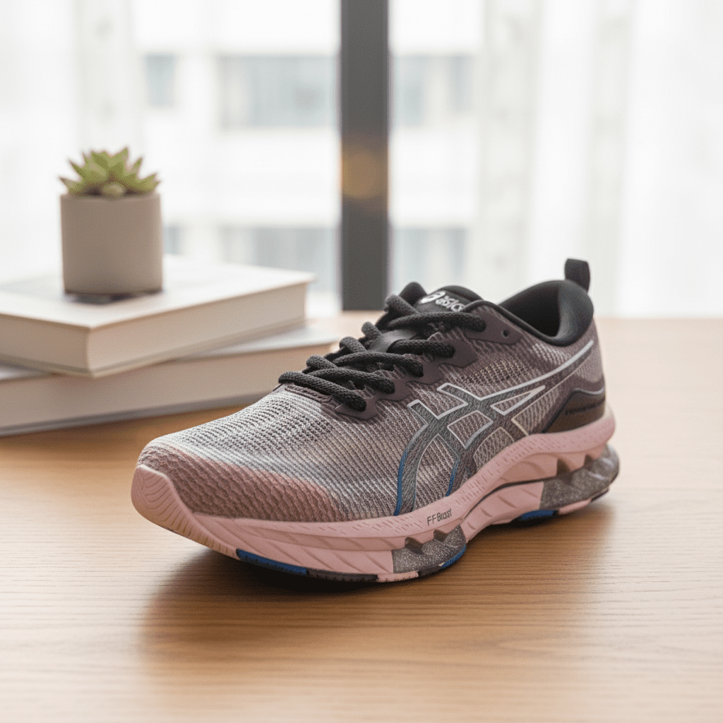 ASICS Pink Purple Gradient Mesh Running Shoes with FF Blast cushioning, iconic white-blue stripes, lightweight and breathable design for men and women, perfect for sports and casual wear.