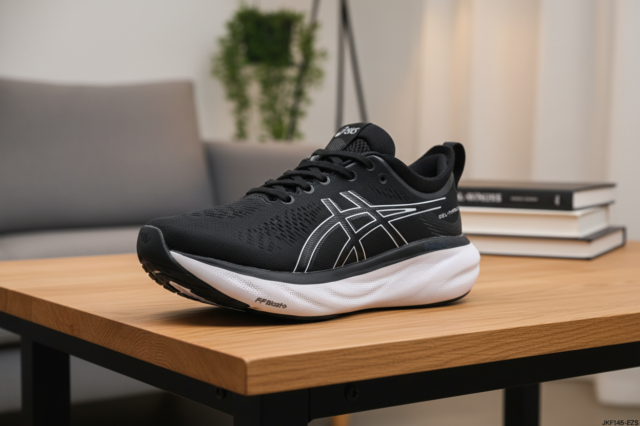 ASICS GEL-NIMBUS black and white running shoes feature breathable mesh upper, FF BLAST+ midsole, GEL cushioning technology, classic design, unisex style, ideal for running and daily workouts.
