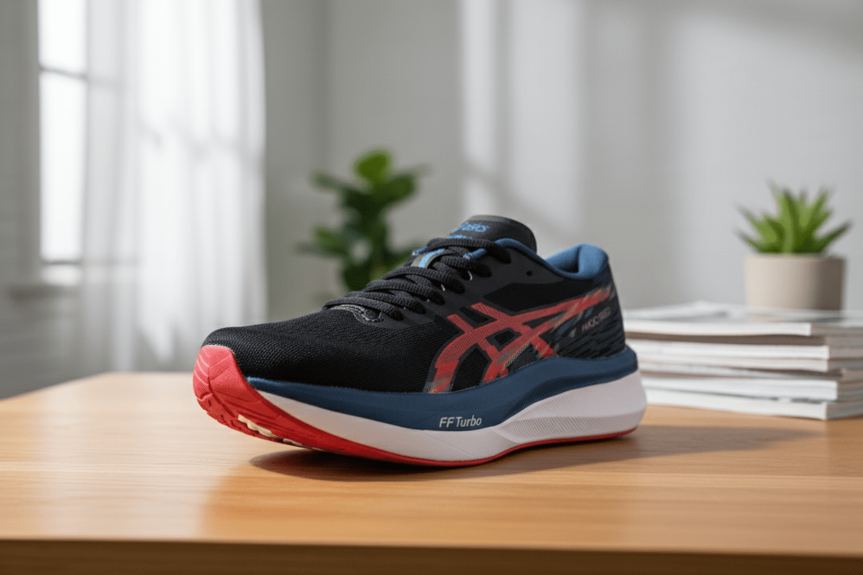ASICS Magic Speed running shoes feature FF Turbo midsole, breathable mesh upper, sleek design with red accents, unisex fit, ideal for training, combining speed, comfort, and performance.