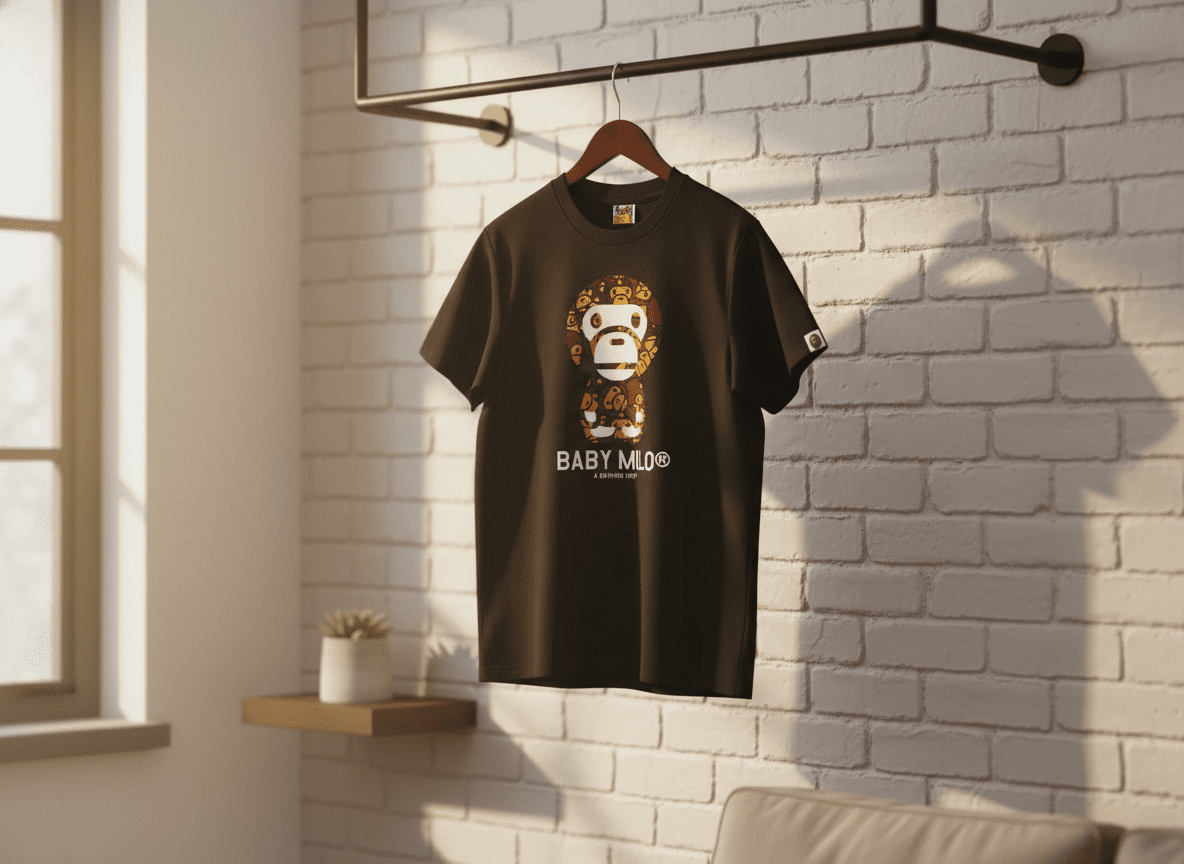 A Bathing Ape Baby Milo Black Cotton T-Shirt featuring iconic Baby Milo monkey graphic, unisex streetwear style, breathable comfort for daily casual looks that express individuality.