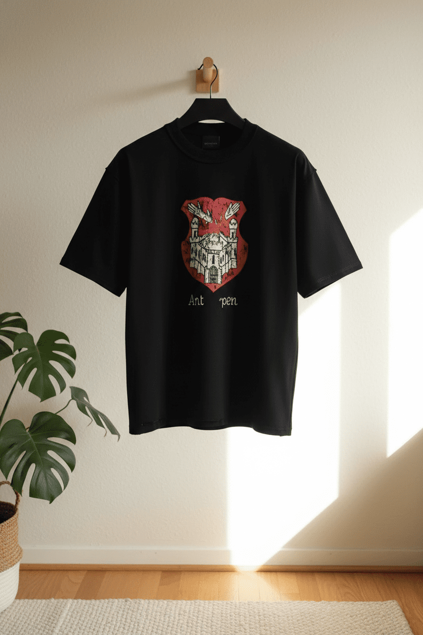 Balenciaga Black Cotton T-Shirt with Red Shield Crest featuring Castle, Hand motifs and “Antwerpen” text, Crew Neck, Unisex Street Style, Perfect for Casual Daily Wear.