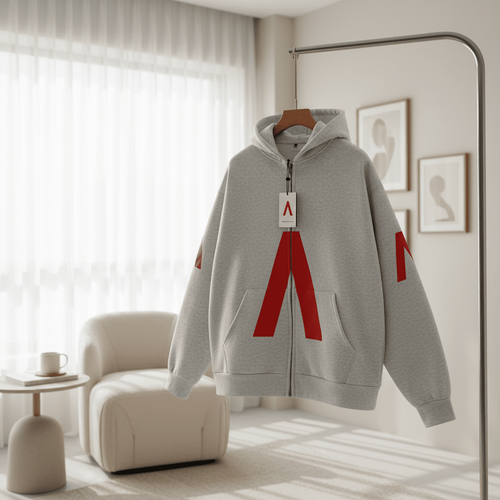 Balenciaga ARCHIVE gray zip-up hoodie, crafted from premium cotton, features a bold red A logo, drawstring hood, and kangaroo pocket. Unisex streetwear combining comfort and iconic style.