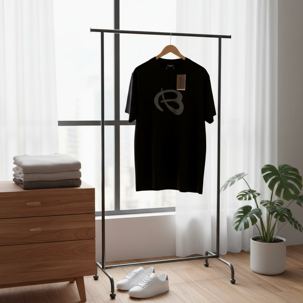 Balenciaga Black Cotton T-Shirt with Gray B Logo, breathable crew neck, unisex design, modern minimalist high-end street style for daily casual fashion wear.