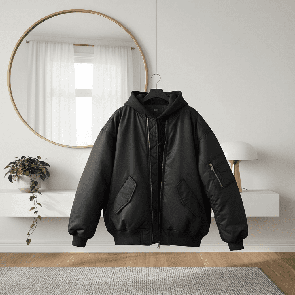 Balenciaga Black Hooded Bomber Jacket, windproof nylon with warm padding, zipper closure and multi-pocket design, unisex street style, modern minimalist look with fashion and comfort.