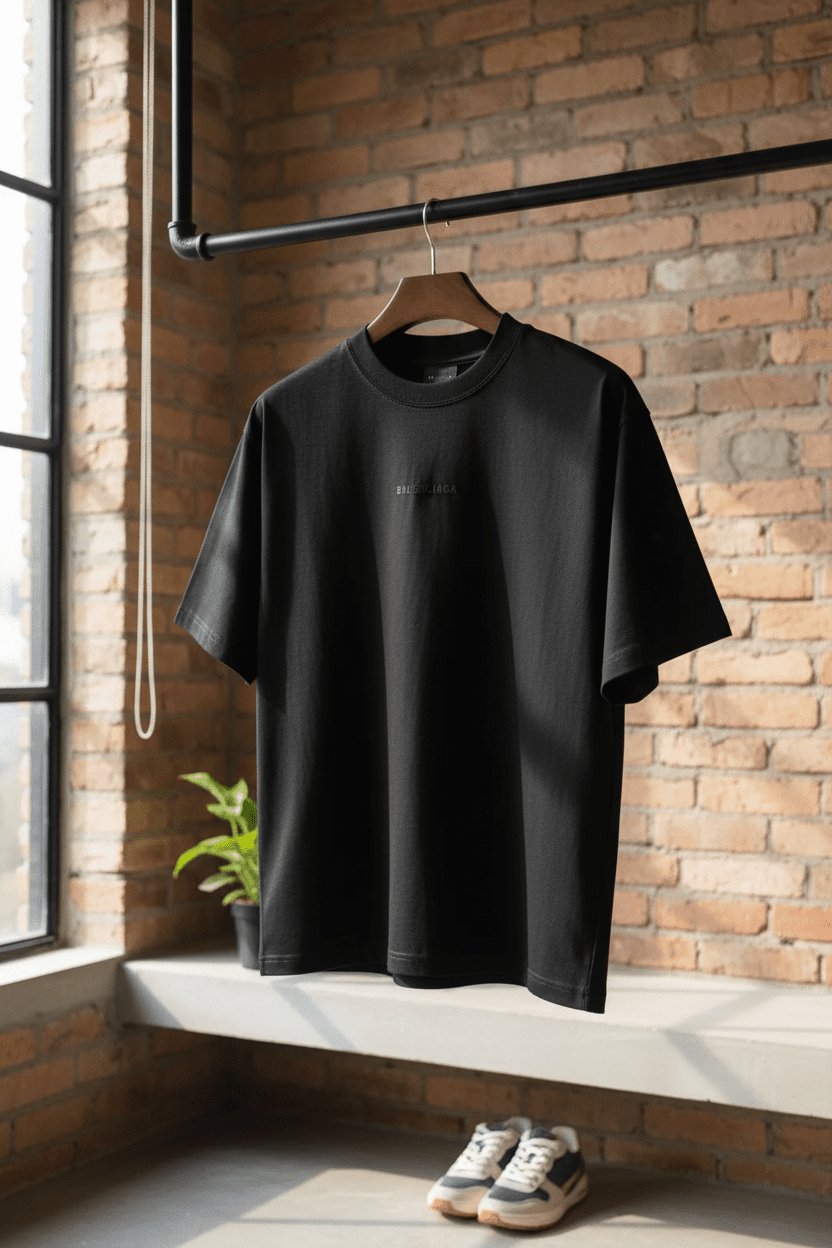 Balenciaga Classic Black Cotton T-Shirt, breathable and comfortable, featuring minimalist chest logo, modern unisex design, perfect for daily casual wear and timeless street fashion style.