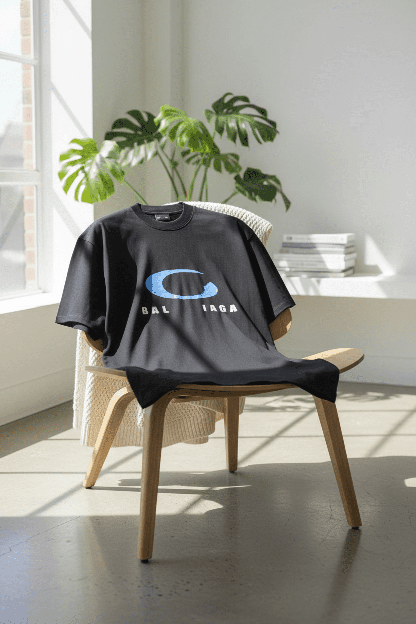 Balenciaga Black Cotton T-Shirt featuring a blue C-shaped emblem and white logo print, breathable and soft fabric, unisex streetwear style perfect for daily casual fashion looks.