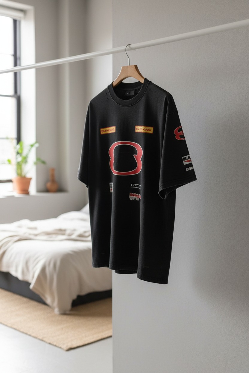 Balenciaga Paris Trend Series Black T-Shirt, breathable cotton fabric with distressed details, multi-logo prints and red number 8 motif, unisex streetwear for modern fashion lovers.