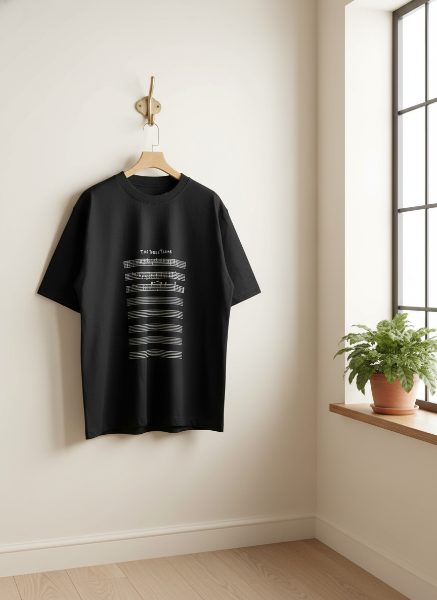 Balenciaga Paris black oversized cotton T-shirt featuring white “The Torch Theme” music score print, soft breathable fabric, unisex style, perfect for trendy and casual everyday wear.