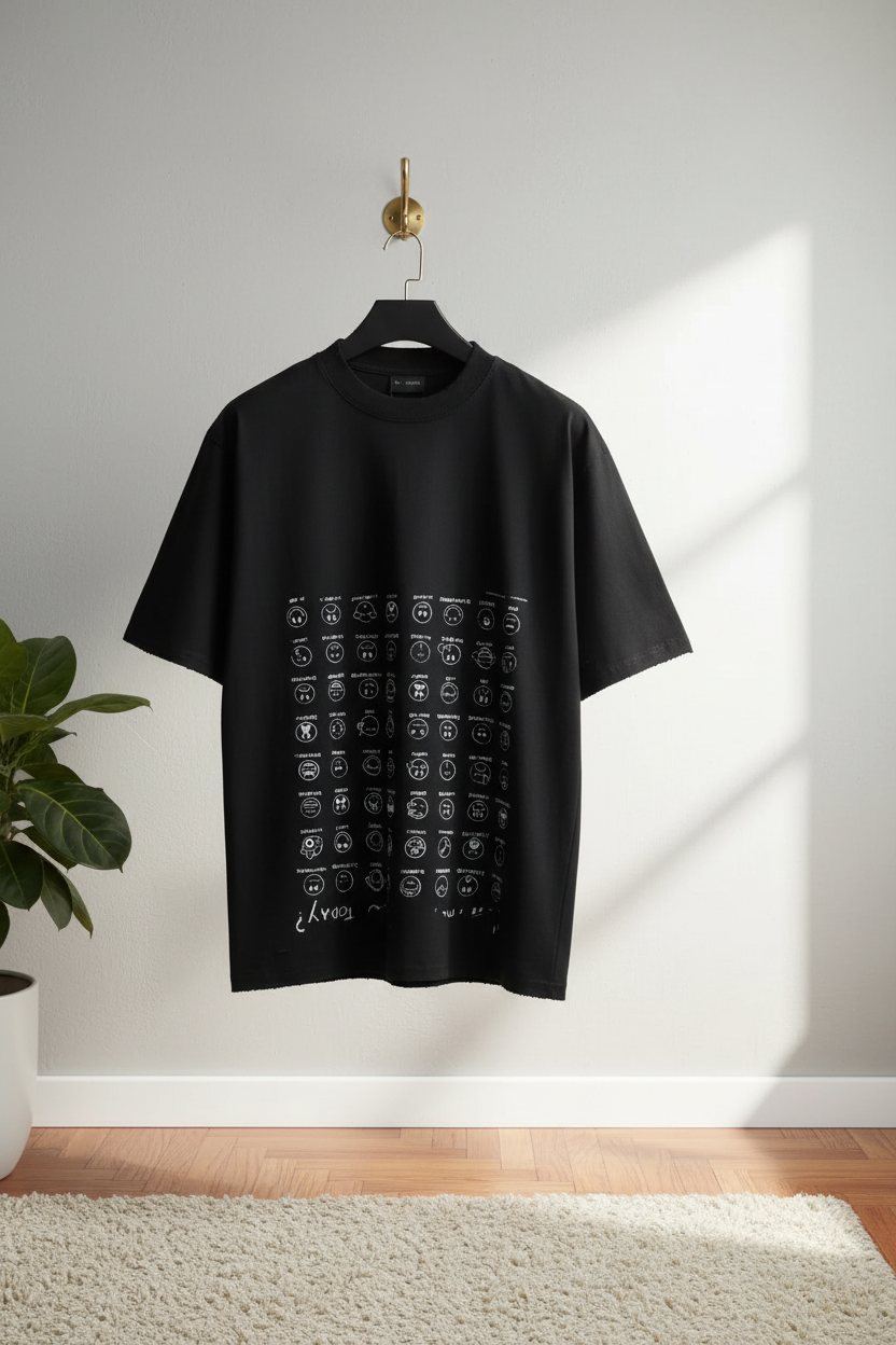 Balenciaga black cartoon emoji print T-shirt, made from soft breathable cotton, featuring full front fun face motifs, unisex streetwear style, perfect for daily casual and trendy fashion looks.