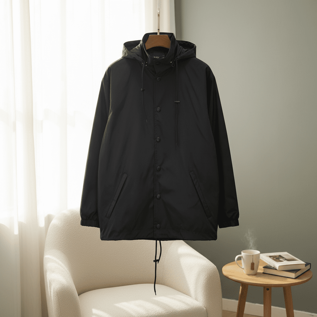Balenciaga black hooded jacket made from waterproof nylon, featuring drawstring hood and button closure. Unisex windproof design for comfort and warmth, perfect for daily casual or commute wear.