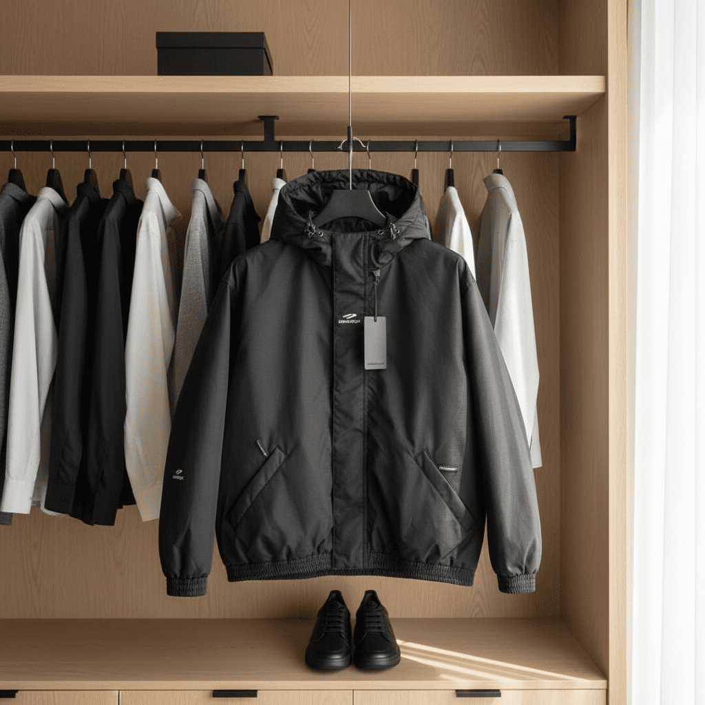 Balenciaga black hooded jacket made from windproof and waterproof polyester, featuring drawstring hood, logo on chest and cuffs, unisex streetwear design, stylish and practical for everyday wear.