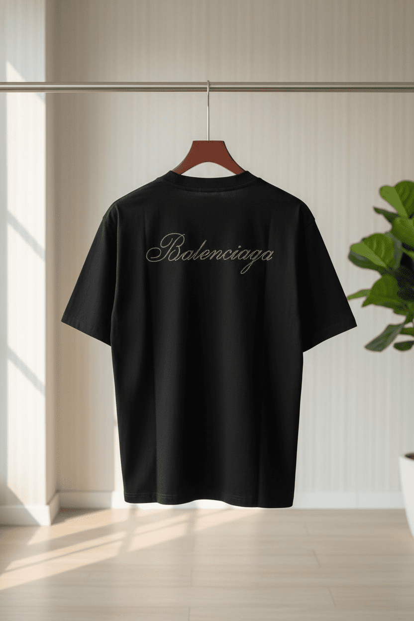 Balenciaga Classic Black T-Shirt crafted from premium soft breathable cotton, featuring a rhinestone logo design on the back. Unisex luxury style, perfect for modern fashion outfits.