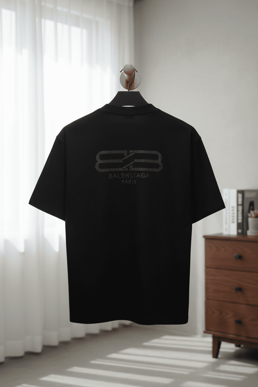 Balenciaga Paris black T-shirt made from soft breathable cotton, featuring the signature logo print on the back. Unisex design, minimalist luxury style perfect for daily casual wear.