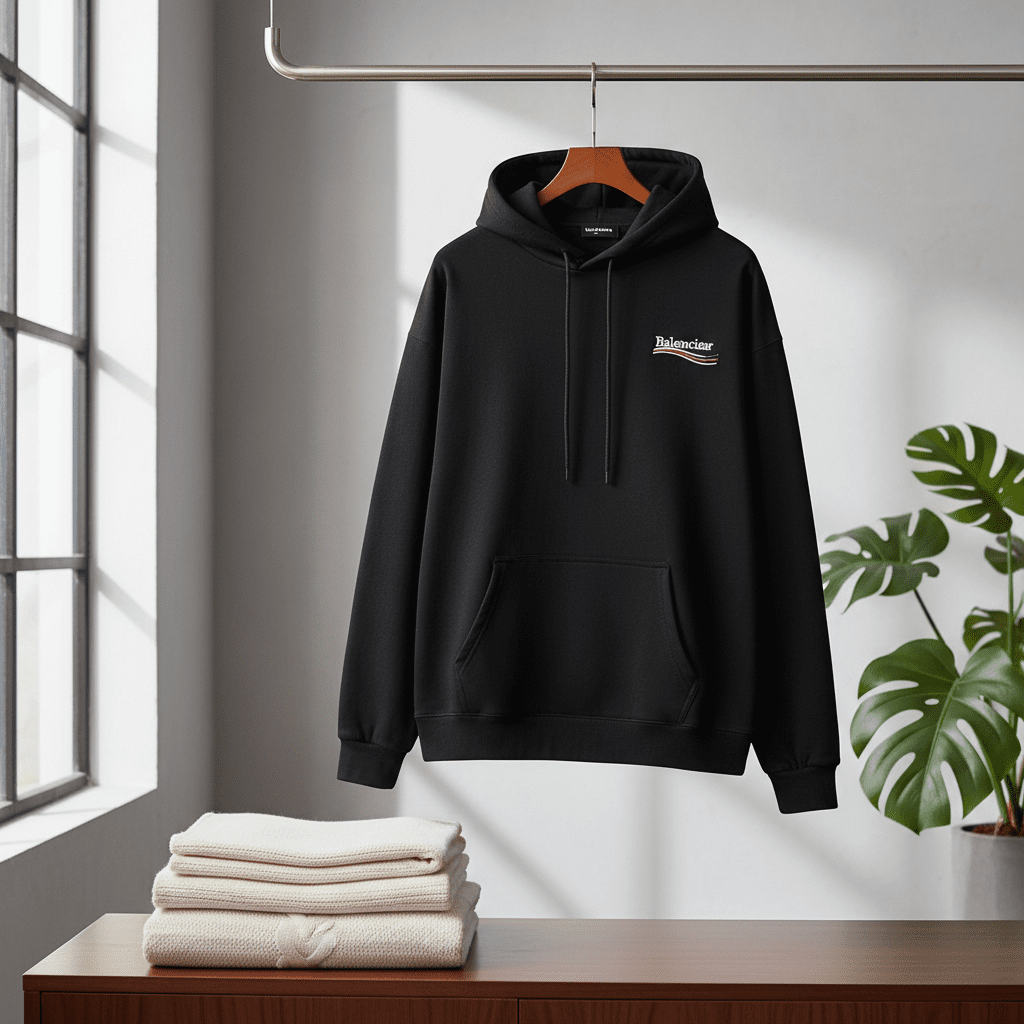 Balenciaga black cotton hoodie, soft and breathable fabric, signature logo embroidery on chest, drawstring hood, front kangaroo pocket, unisex design, modern street style comfort.
