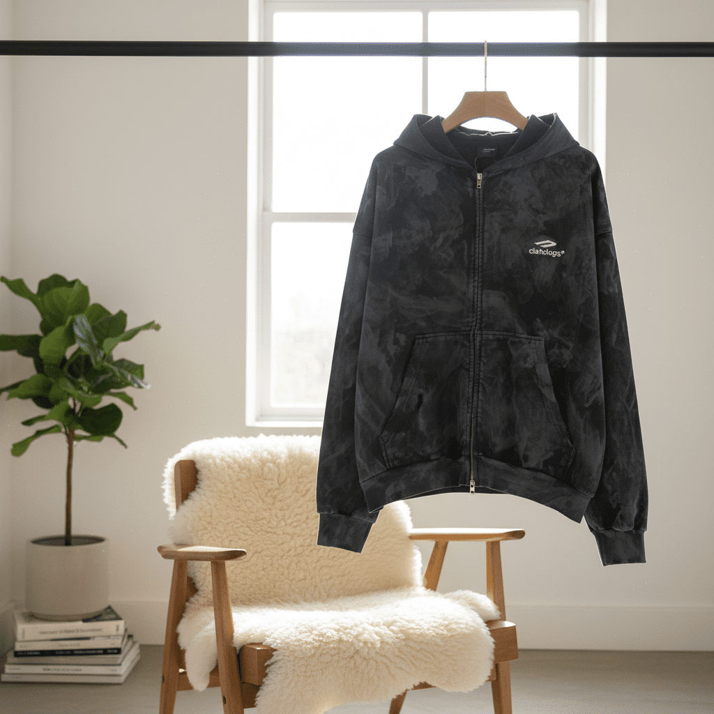 Balenciaga black gray tie-dye zip hoodie, soft cotton fabric, front logo detail, kangaroo pocket, unisex loose fit, streetwear style for comfort and fashion.