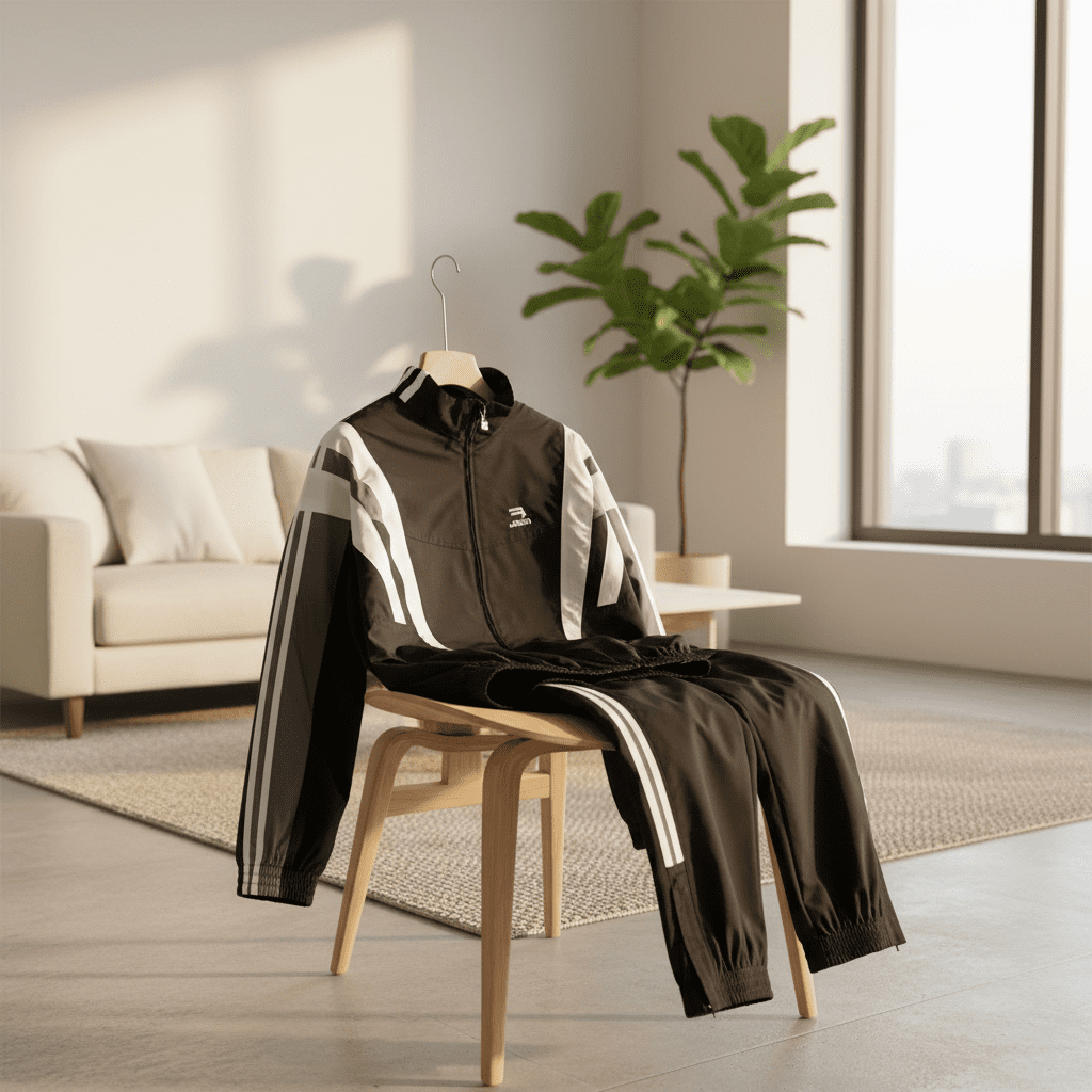 Balenciaga Sports Series black, gray, and white color-block tracksuit, polyester fabric, stand collar zipper, elastic cuffs, unisex streetwear style combining comfort and fashion.