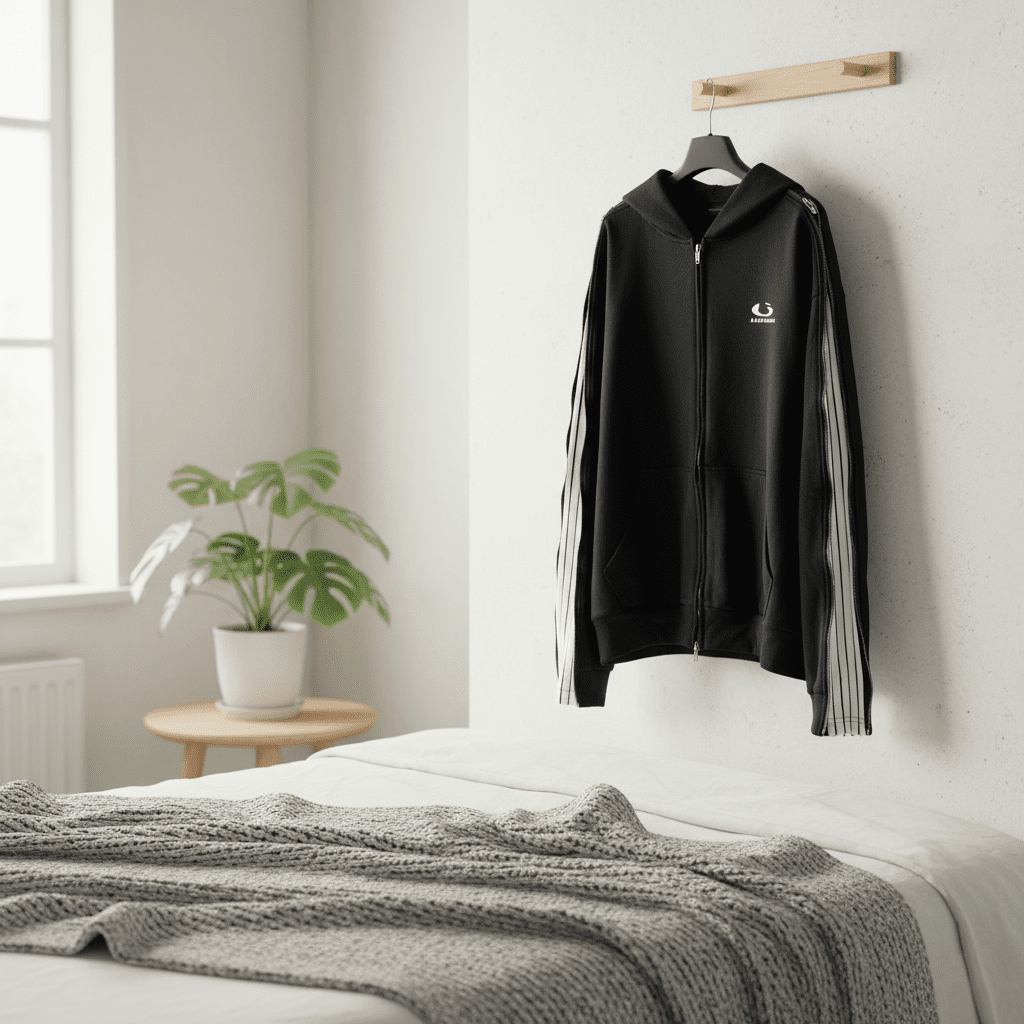 Balenciaga Black Zip-Up Hoodie, soft cotton fabric for comfort, signature logo on chest, white striped sleeves with zipper details, unisex streetwear for daily casual style.
