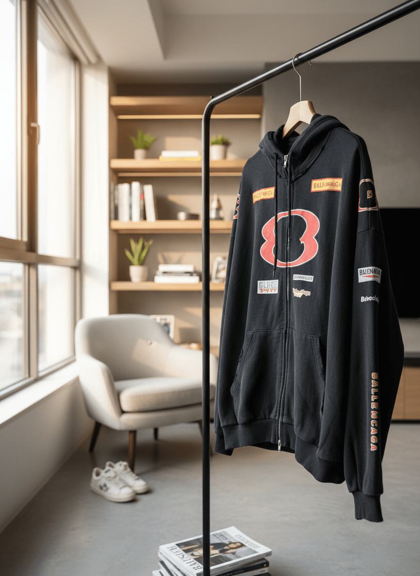 Balenciaga black cotton zip-up hoodie featuring bold red B logo and multi-tag design. Warm, comfortable, and unisex streetwear style perfect for daily casual outfits.