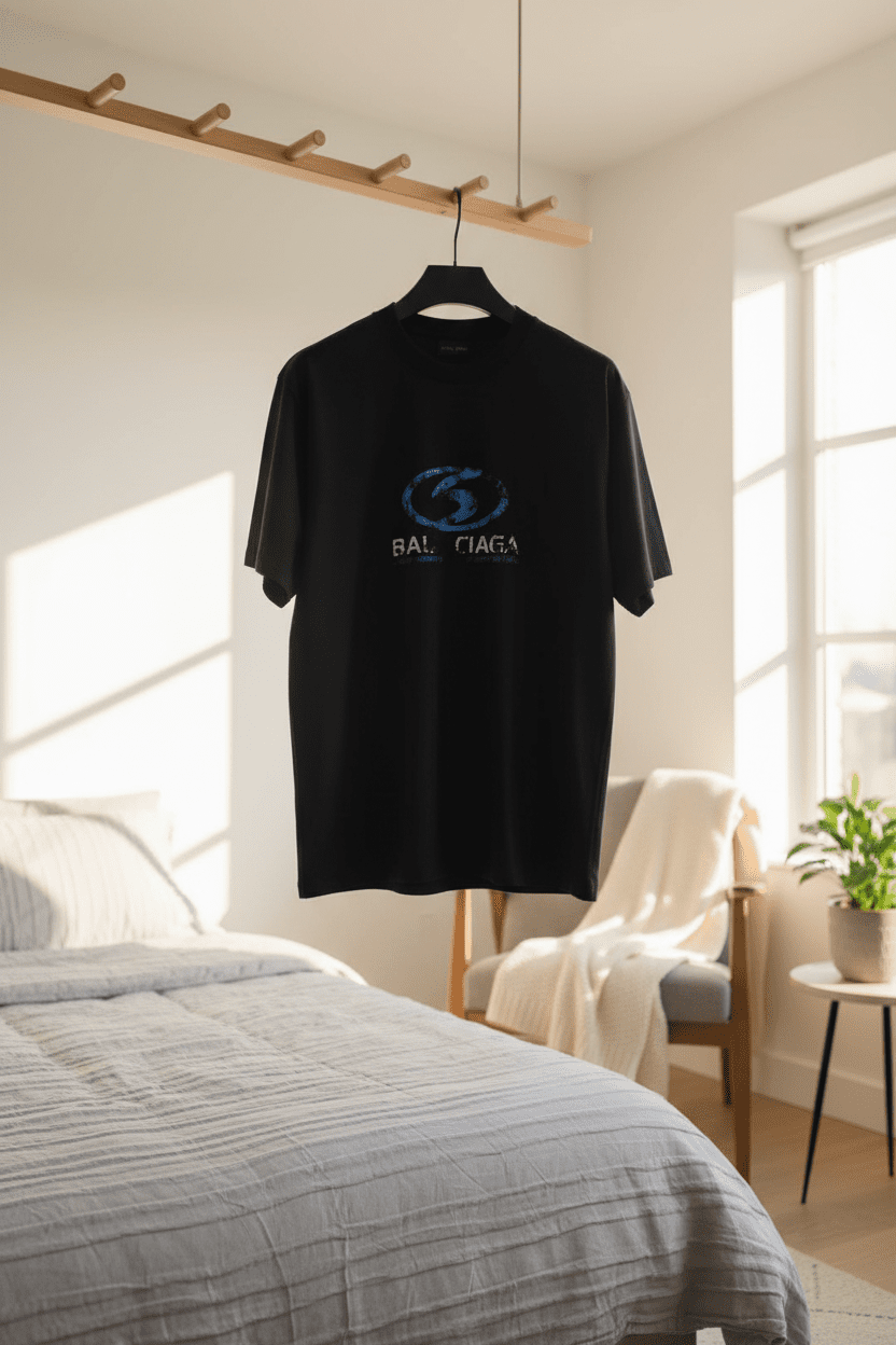 Balenciaga Black Street Style Cotton T-Shirt with Blue Distressed Graphic, Soft Breathable Fabric, Crew Neck Design, Unisex Casual Wear for Trendy Everyday Look.