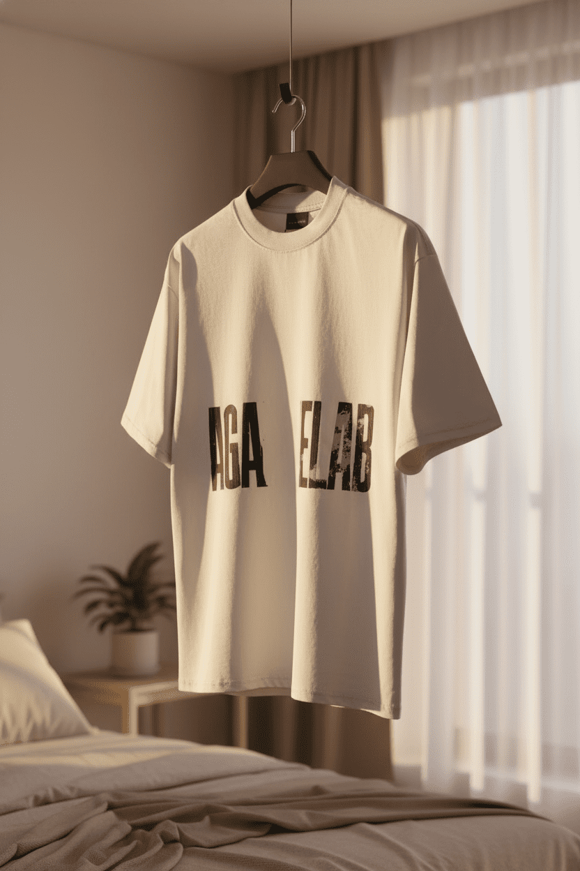 Balenciaga white oversized cotton T-shirt featuring black distressed “AGA ELAB” graphic, breathable and stylish for street fashion, unisex design perfect for daily casual wear.