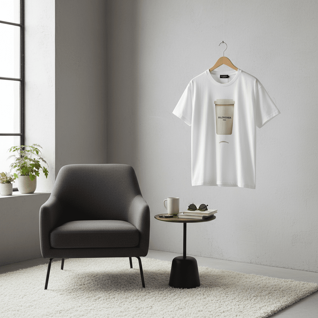 Balenciaga Coffee Cup White T-Shirt, premium cotton fabric, front coffee cup graphic, back brand logo print, unisex streetwear style, perfect for casual everyday fashion.