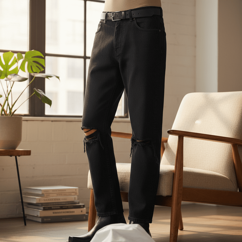 Balenciaga Black Distressed Denim Pants feature bold knee rips, gender-neutral street style, modern avant-garde design, and comfortable daily wear that showcases unique fashion attitude.