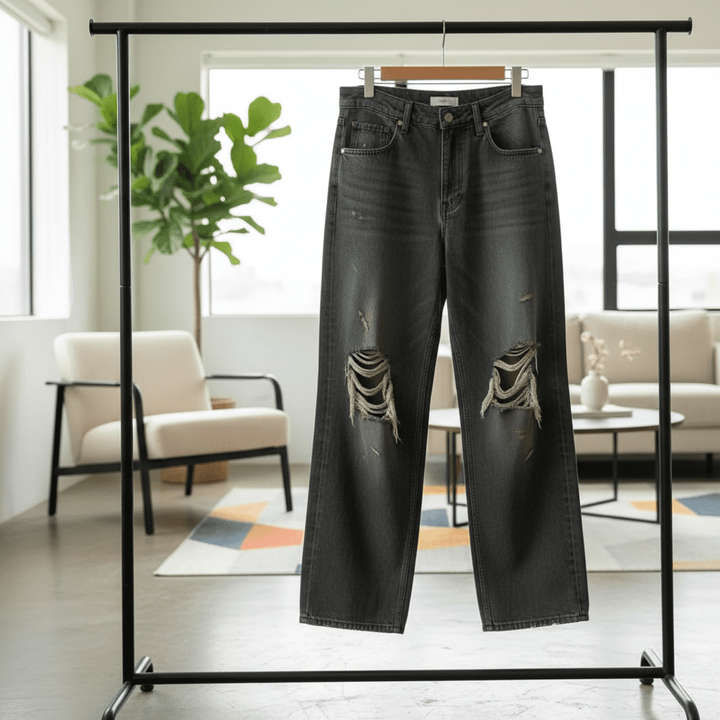 Balenciaga Grey-Green Distressed Ripped Jeans, premium denim fabric, loose fit, large knee holes with frayed edges, unisex streetwear style, perfect for daily casual looks and individual expression.