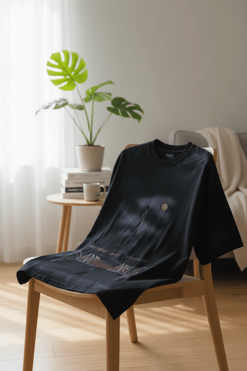 Balenciaga Black Cotton T-Shirt featuring Eiffel Tower night graphic and distressed logo design, soft breathable fabric, streetwear unisex style for casual trendy everyday wear.