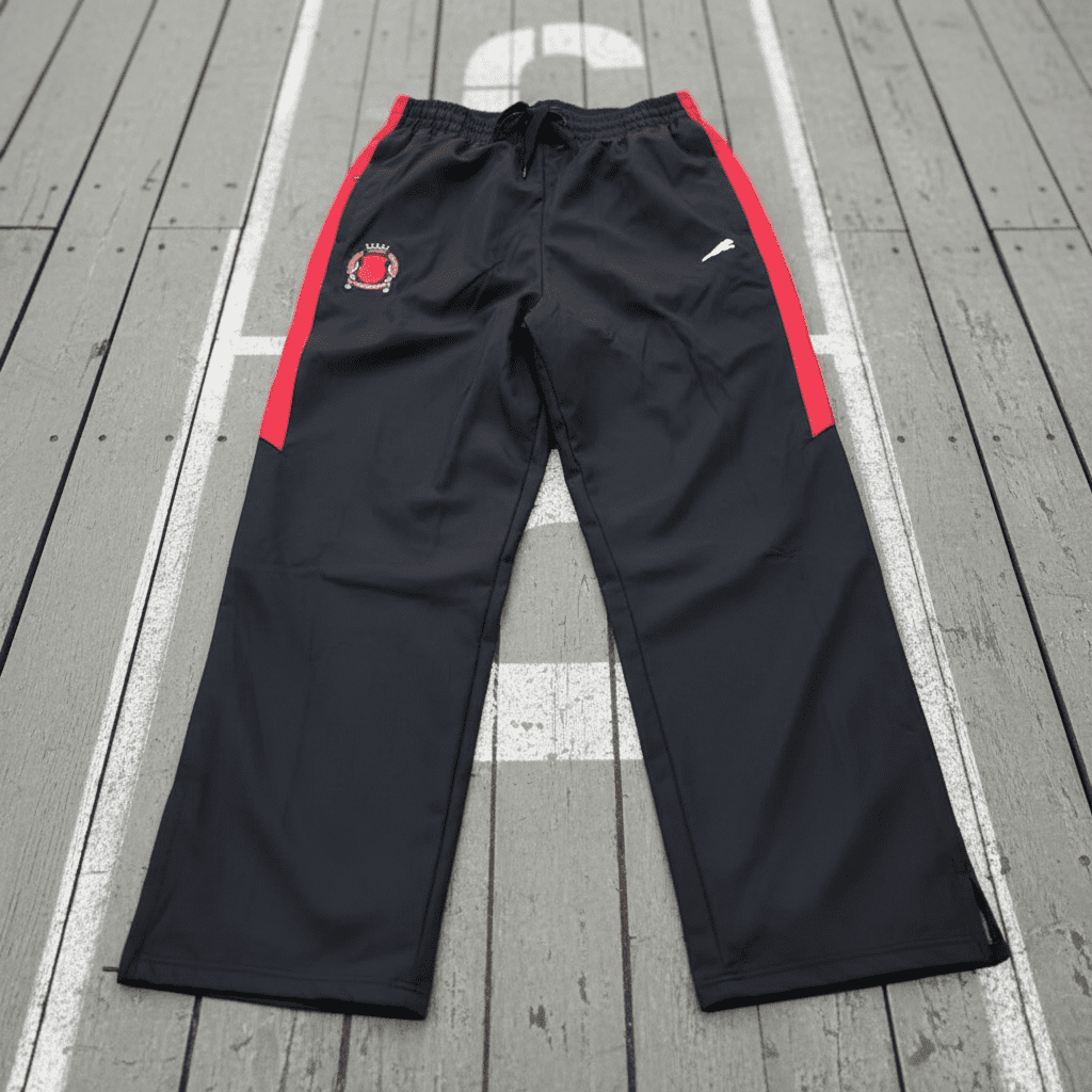 Elevate your style with sleek black track pants featuring red accents, embroidered details, and a comfortable elastic waistband. Perfect for athletic wear or casual outings.