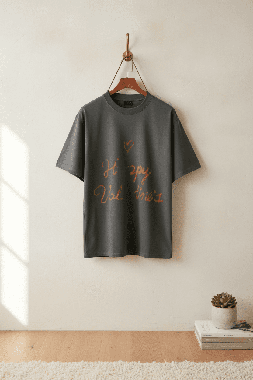 Balenciaga dark gray cotton T-shirt, soft and breathable with a loose crew neck, red handwritten “Happy Valentine’s” and heart print, unisex streetwear for casual daily style.