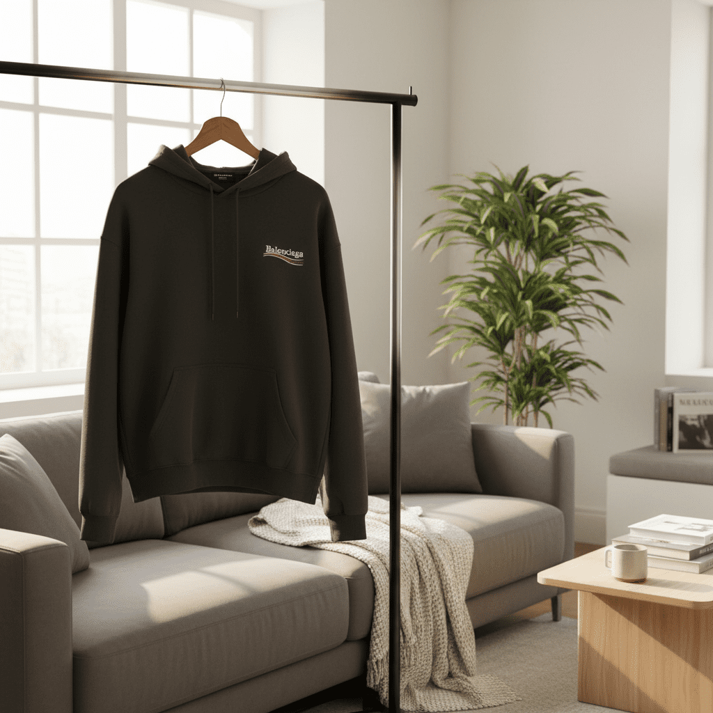 Balenciaga Dark Gray Cotton Hoodie featuring red, white and blue chest logo, drawstring hood, and kangaroo pocket; soft breathable fabric, unisex streetwear for stylish everyday casual looks.