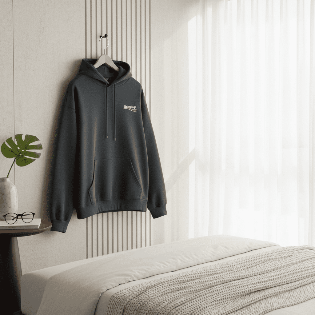 Balenciaga Black Hoodie – Soft cotton fabric, red-white-blue logo detail, drawstring hood, kangaroo pocket, unisex streetwear design for trendy casual style.