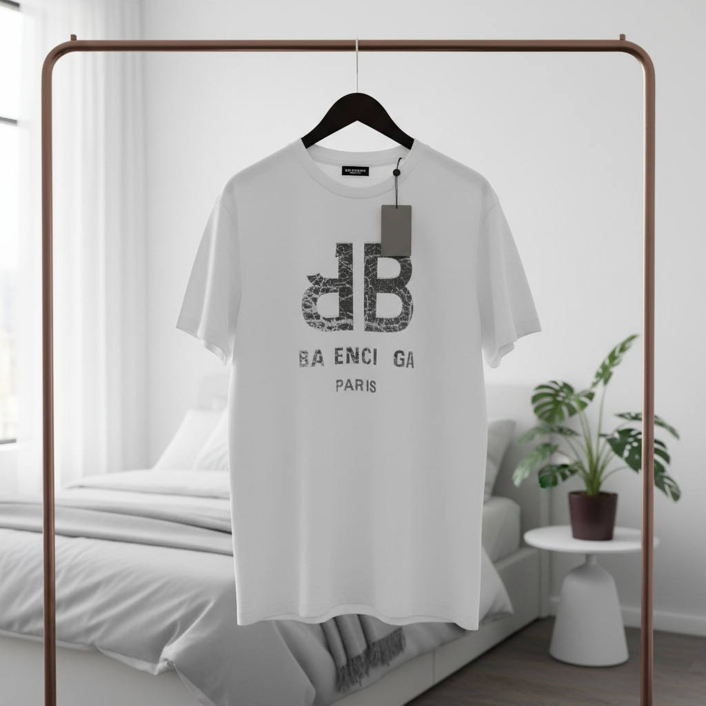 Balenciaga Paris white cotton T-shirt, breathable and soft, featuring distressed dB totem and BALENCIAGA PARIS print on back. Unisex street style for trendy everyday wear.