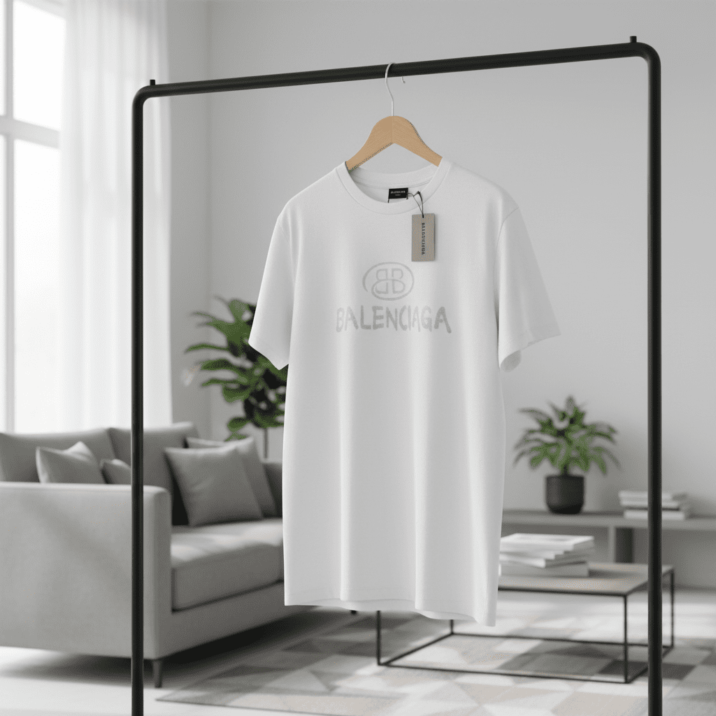 Balenciaga white cotton T-shirt with pink double-B logo and brand print, soft breathable unisex design, minimalist high-end style perfect for daily casual wear.