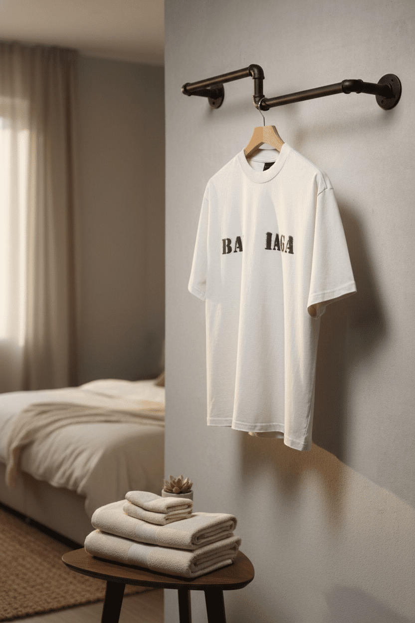 Balenciaga white cotton T-shirt with black “BAI IAGA” print, soft breathable fabric, loose round-neck design, unisex streetwear style, perfect for modern casual everyday outfits.