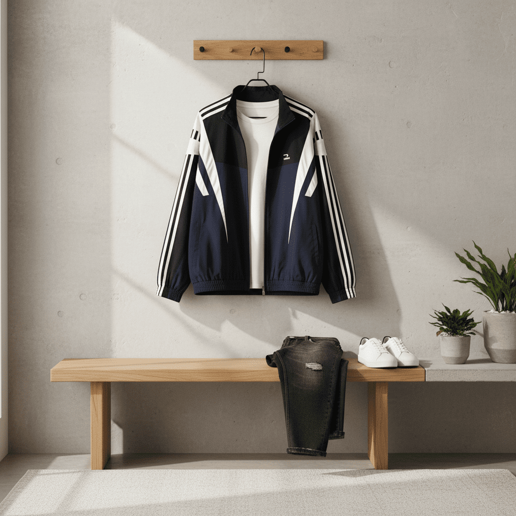 Balenciaga Sports Series windbreaker in black, blue, and white. Made from lightweight polyester with a color-block design, stand collar, and zipper. Unisex streetwear style, modern, comfortable, and functional.