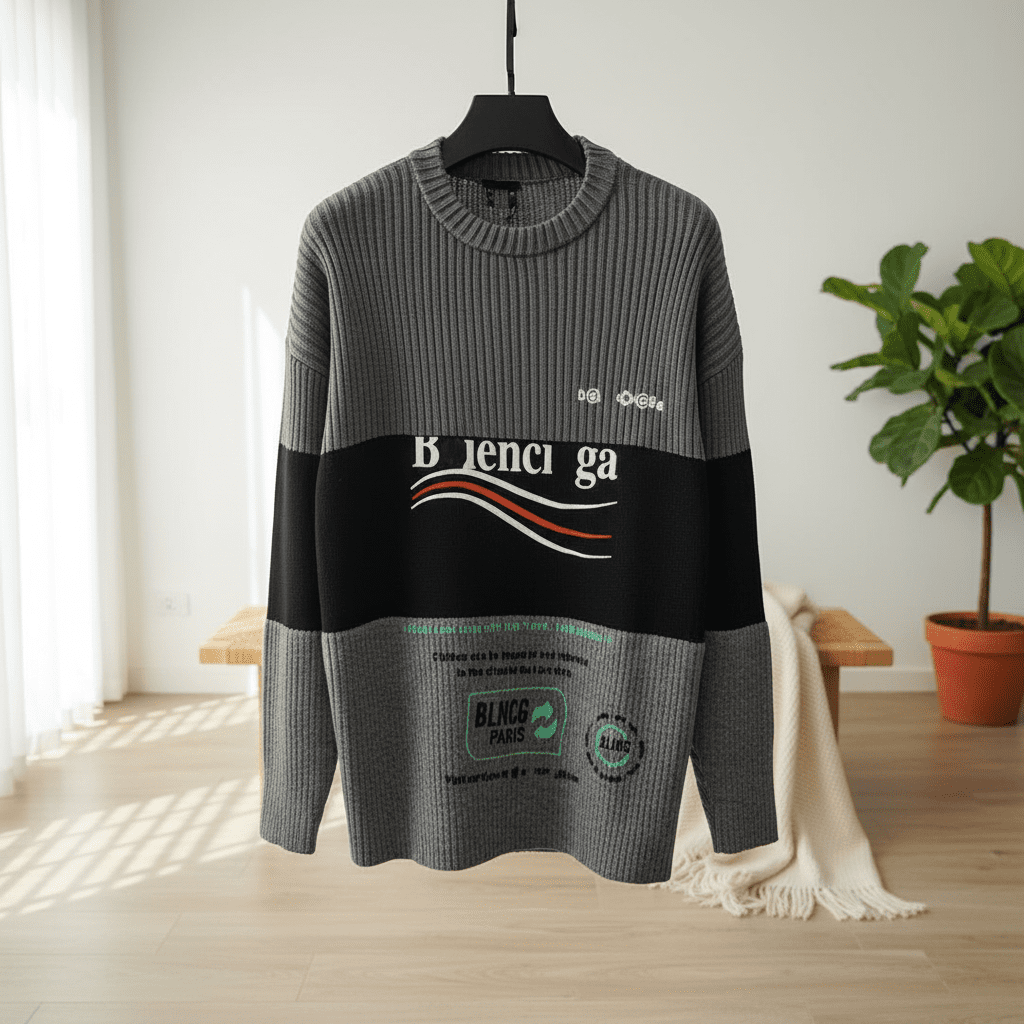 Balenciaga Grey-Black Knitted Sweater, made of soft knit fabric with logo and graphic design, street fashion unisex style, comfortable, trendy, and perfect for versatile everyday wear.
