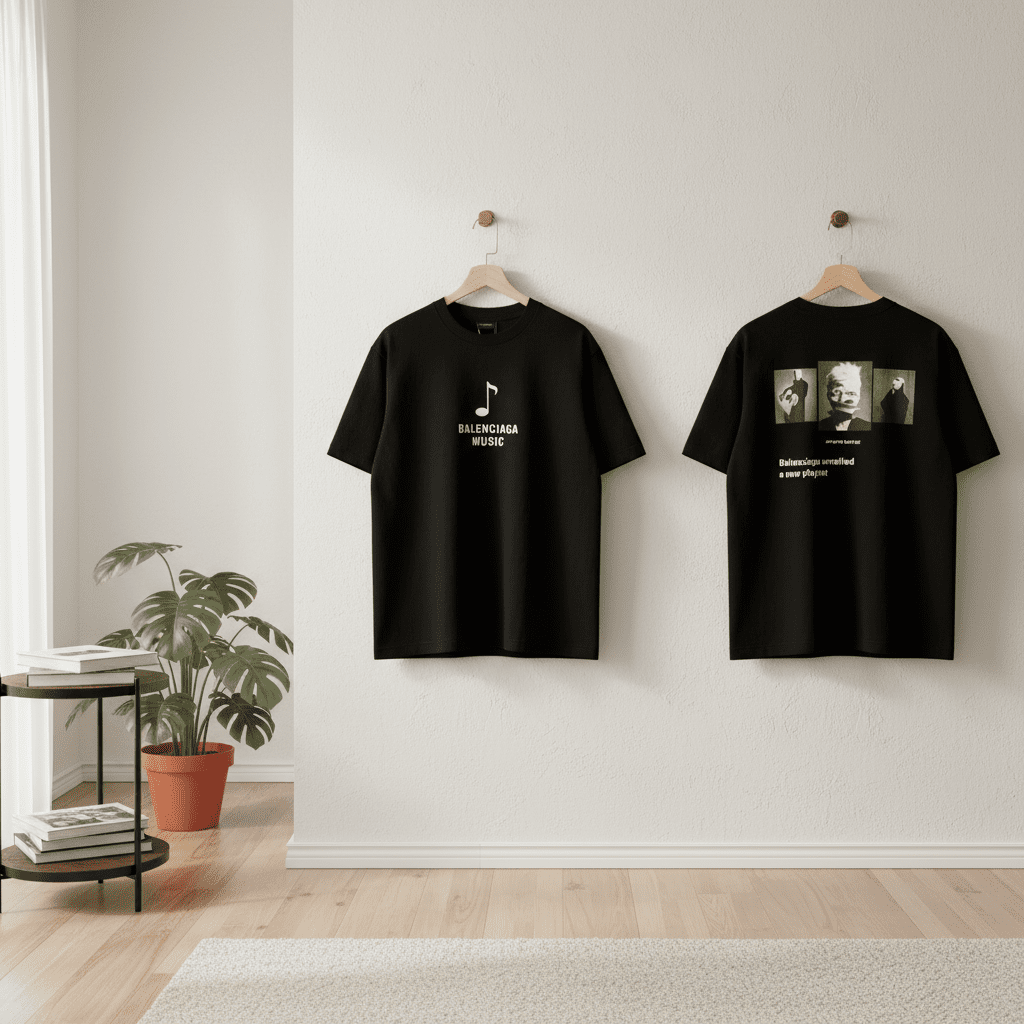 Balenciaga Music Series Black T-Shirt, crafted from premium cotton, breathable and soft, featuring front note and logo print, back photo graphic design, unisex streetwear for casual everyday style.