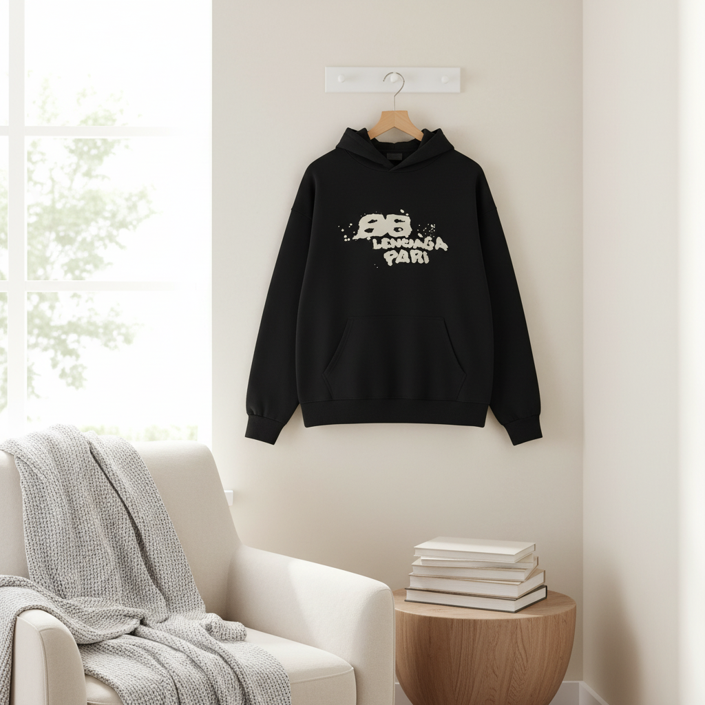 Balenciaga Black Hoodie – Soft breathable cotton, graffiti-style “BB BALENCIAGA PARIS” print, drawstring hood, front kangaroo pocket, unisex streetwear style showcasing modern luxury fashion.