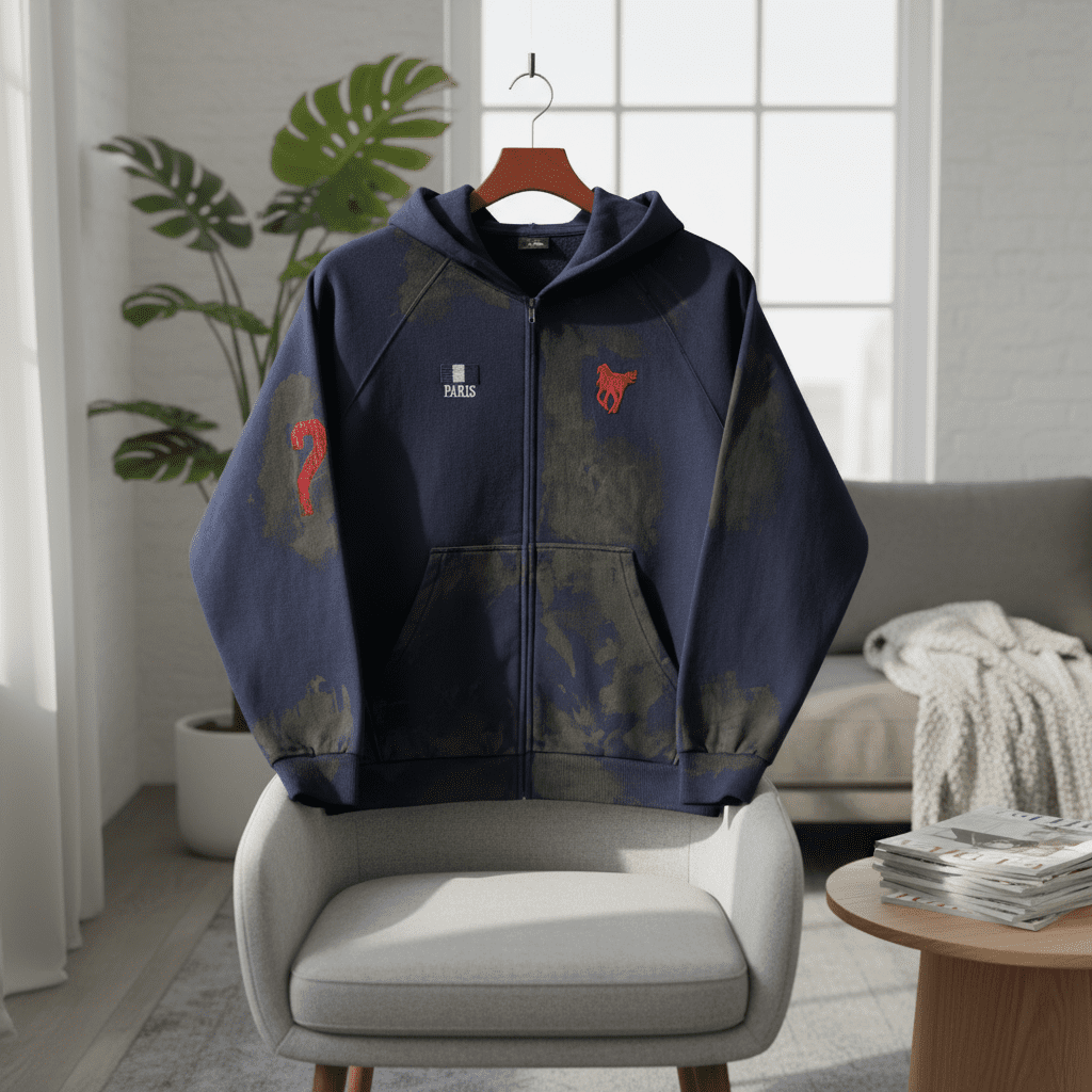 Balenciaga Paint Splash Series Navy Zip Hoodie, soft cotton fabric, easy zip closure, red embroidery and splash print, unisex streetwear style for bold and modern fashion.
