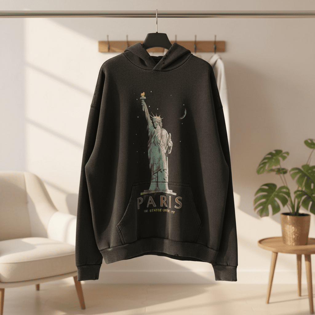 Balenciaga black cotton hoodie, soft and comfortable, featuring Statue of Liberty and PARIS graphic print, unisex streetwear style with hooded design for warmth and casual fashion attitude.