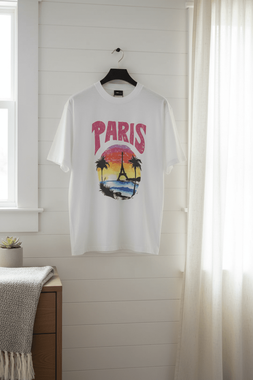 Balenciaga Paris White Cotton T-Shirt, breathable and comfortable, loose round neck, front “PARIS” print with Eiffel Tower sunset palm design, unisex streetwear for stylish casual daily look.