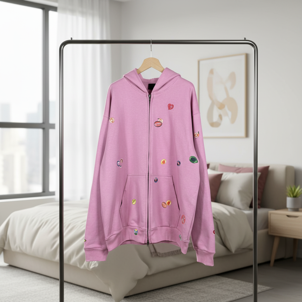 Balenciaga Pink Zip-Up Hoodie – Soft cotton, unisex loose fit, vibrant cartoon prints, streetwear style, full zip front, practical kangaroo pocket, perfect for casual everyday looks.