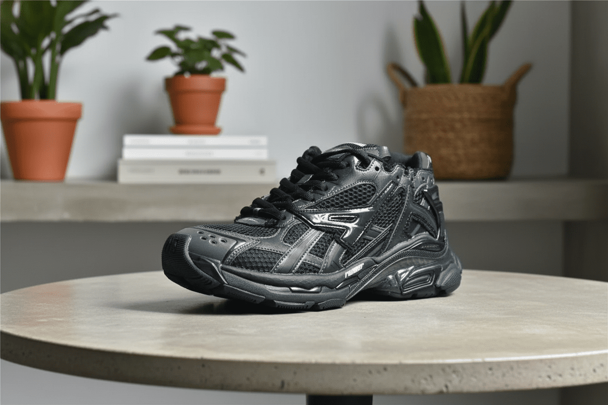 Balenciaga Runner Black Sneakers combine mesh and synthetic materials in a chunky, cushioned sole design; unisex, streetwear-inspired, modern style showcasing the brand’s unique fashion identity.