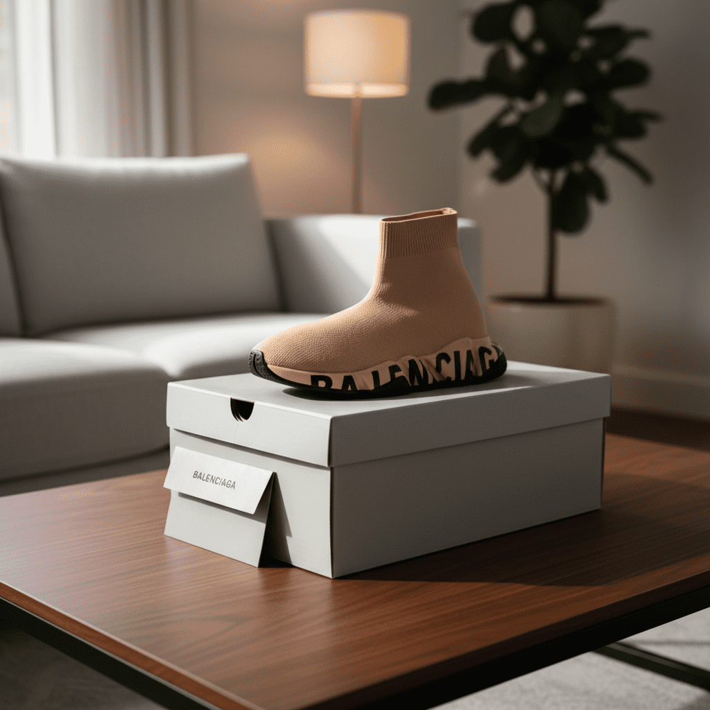 Balenciaga Speed Nude Pink Sock Sneakers feature a soft breathable knit upper, logo rubber sole, high-top sock fit, unisex street style for daily wear and light sports, blending comfort and fashion.