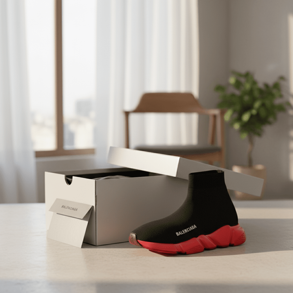Balenciaga Speed Trainer black and red sneakers feature a knit sock upper with bold red sole, unisex design, breathable comfort, and cutting-edge street style for modern trendsetters.