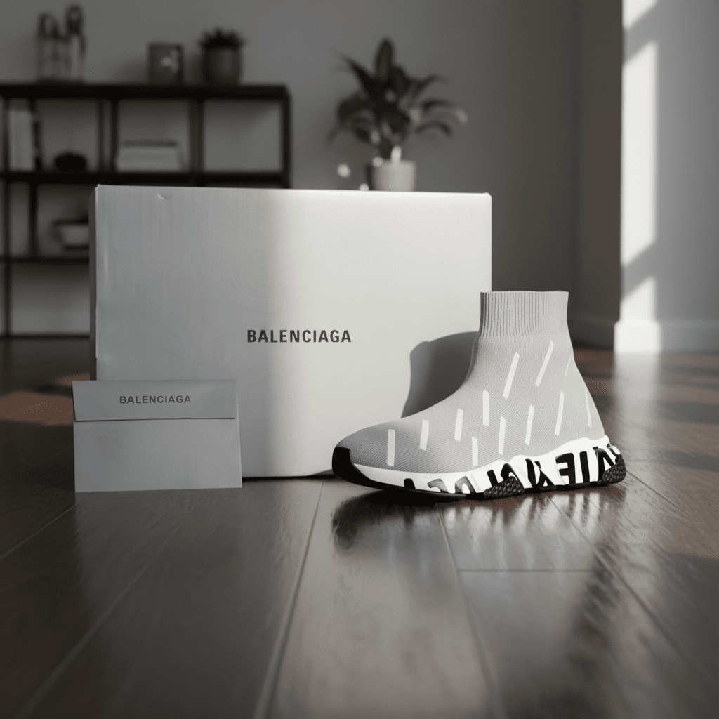 Balenciaga Speed Gray Sneakers feature breathable knit fabric, reflective stripes, sock-fit high top design, logo sole, anti-slip durability, unisex street style with modern comfort.